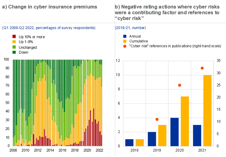Heightened risks of cyberattacks have increased global demand for cyber insurance, and there are nascent signs of rating downgrades resulting from cyber incidents. So far, cyber insurance remains a niche segment mainly concentrated in the United States. However, with the increasing frequency of cyberattacks over the last decade, non-financial firms’ demand for insurance against cyberattack-related losses has risen commensurately. This has, in turn, pushed insurance premiums sharply upwards (Chart C.7, panel a). For instance, US insurance rates increased by 27% in the second quarter of 2022 compared to the previous quarter. Insurers cite systemic exposures and accumulation risk – including the risks resulting from the Russian invasion of Ukraine – as potential significant loss-triggering events.[17] At the same time, rating agencies have started to incorporate cyber risks into the social pillar of their ESG scores. Over recent years, cyber risk has increasingly featured in rating agency publications and has already resulted in some negative rating actions (Chart C.7, panel b).[18]