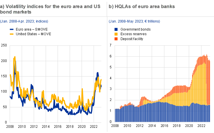 Concerns have recently been increasing over the resilience of liquidity. For much of the last decade, volatility in bond markets has been low (Chart A.1, panel a) and holdings of high-quality liquid assets (HQLAs) in the banking sector have been large (Chart A.1, panel b). Recently, though, these tailwinds have started to change direction. Despite a regime of continuing high excess reserves, liquidity conditions have become more fragile and, at times, unreliable. Moreover, a constellation of a subdued free float of high-quality debt securities and globally high inflation, which has introduced uncertainty as to the future path of monetary policy, has greatly increased volatility in bond markets.