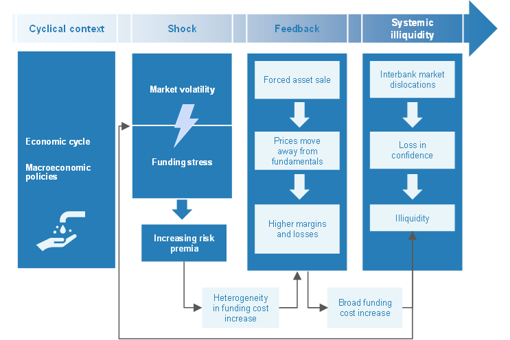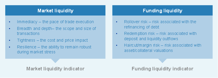 When liquid, financial markets provide efficient, reliable pricing of financial assets, and funding can be easily obtained at a fair price. Liquidity consists of two main pillars: market liquidity and funding liquidity. Market liquidity may be defined as the ability to rapidly execute large transactions at a low cost and with a limited price impact. Funding liquidity indicates the ease of borrowing conditions and capital flows in global financial markets. Focussing on the specific dimensions of market liquidity and funding liquidity, and distinguishing between them, can provide clarity on how their interaction can create adverse liquidity spirals which harbour the potential for systemic stress.