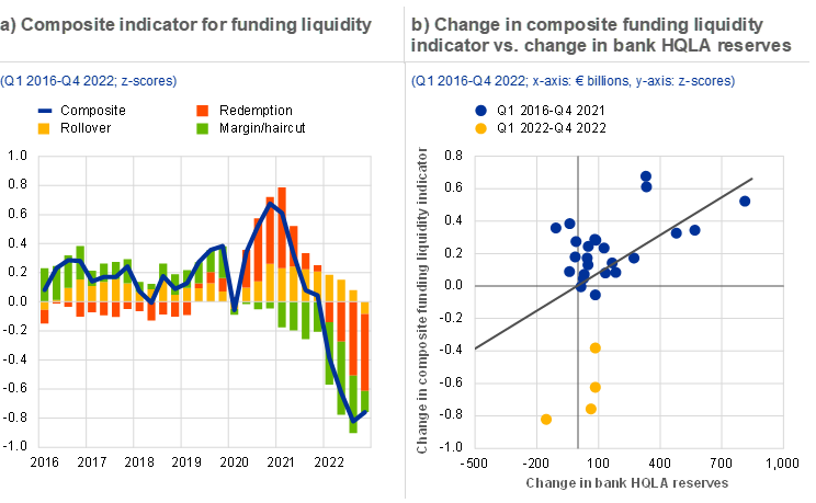 Notes: Panel a: composite liquidity indicator based on, for rollover risk: deposit flows agreed maturity, overnight and term deposit rates to households and non-financial corporations, non-deposit funding as a share of total funding, yields on covered, senior bail-inable and senior unsecured debt, short rates for secured MMSR transactions, €STR market depth, interbank repo volumes, the EURIBOR-OIS spread, position in the monetary corridor (floor versus corridor) and euro-dollar cross-currency basis; for redemption risk: deposit growth rates for households, non-financial corporations and non-monetary financial institutions, the euro short-term rate minus agreed deposit rate for households and non-financial corporations and the liquidity coverage ratio; for haircut/margining risk: asset encumbrance ratio, collateral reuse ratio, market funding encumbrance ratio, share of covered bonds in total bond issuance volume and Schatz volatility. The indicators are first aggregated for deposit rates, yields and deposit growth, then taken as a simple average over all indicators to construct the composite indicator. Panel b: the chart shows the OLS fit between the change in the composite funding liquidity indicator and the change in bank HQLAs between Q1 2016 and Q4 2022.