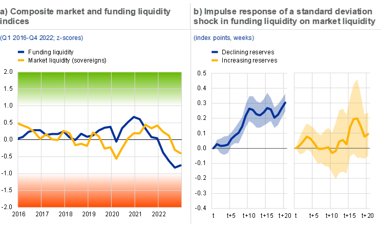 Notes: Panel a: for a description of the indicators, see the notes for Charts A.2 and A.3. Panel b: the chart shows impulse response functions with their respective 95% confidence bands for market liquidity – as proxied by the Bloomberg Liquidity Index for German sovereign bonds – after a shock in funding liquidity, as proxied by the EURIBOR-OIS spread. Higher values mean lower liquidity. The results are corrected for implied volatility (VSTOXX), log returns in the EURO STOXX Banks index and economic surprises (Citi Economic Surprise Index). Increasing and decreasing reserves are defined by changes in excess liquidity. Excess liquidity is defined as deposits at the deposit facility net of the recourse to the marginal lending facility. The impulse response functions were estimated using a non-linear local projection model* on weekly data between 1 January 2008 and 31 February 2023. The shaded areas represent 90% confidence intervals using Newey-West standard errors robust to heteroscedasticity and autocorrelation.