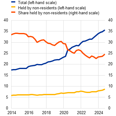 Over the last decade, foreign investors have been major holders of both euro area and US government debt, accounting for between one-fifth and one-third of all holdings of government debt in these economies. With around €2,600 billion at the end of the fourth quarter of 2024 (Table A.1), around 23% of outstanding euro area government debt was held by non-residents (Chart A.1). This share had started to decline when the Eurosystem acquired euro area government debt as part of its asset purchase programmes but has increased again since net purchases came to an end in mid-2022.[13] Holdings of US government debt exhibit a similar trend, as the share of non-resident holdings in total outstanding US Treasuries declined over the past decade and has recently risen to around 24%.[14]