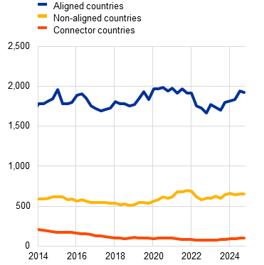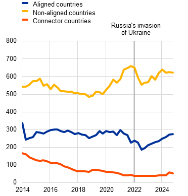 Euro area government debt held by the official sector in non-aligned countries has slightly decreased since Russia’s invasion of Ukraine, while total foreign official holdings rebounded to close to historic highs. Non-aligned countries excluding Russia, account for the bulk of foreign official sector holdings of euro area government debt (Chart A.5, panel a). Following Russia’s invasion of Ukraine in early 2022, non-aligned foreign official holdings dropped somewhat in the second quarter of 2022 and have increased slightly since then. From the end of 2021 onwards, the decline in these holdings has been limited to around 5% of pre-war holdings, highlighting the importance of upholding the rule of law. Moreover, they are still well above the levels witnessed at the time of Russia’s annexation of Crimea in 2014. After an initial drop in early 2022, foreign official holdings of aligned countries grew strongly, while those of connector countries also picked up slightly in the latter half of 2024. As a result, overall foreign official holdings rebounded, while the share of foreign official sector holdings held by non-aligned countries declined somewhat between the end of 2021 and the fourth quarter of 2024 (Chart A.5, panel b). While substantial as a share of foreign official sector holdings, non-aligned foreign official holdings accounted for a small portion, around 6%, of the outstanding euro area government debt in this period.