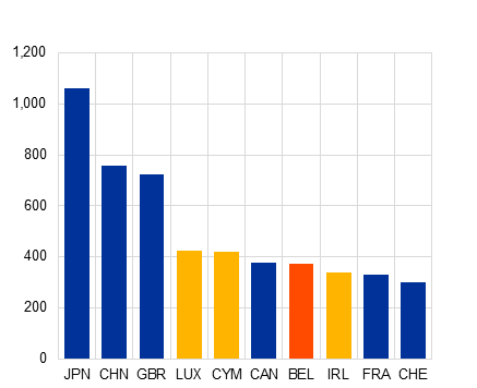 Notes: In panel a), the bars for the financial centres and Belgium (where Euroclear is located) are highlighted in yellow and red respectively. Panel b) reproduces figures reported in Beck, R., Coppola, A., Lewis, A., Maggiori, M., Schmitz M. and Schreger, J., “The geography of capital allocation in the euro area”, Working Paper Series, No. 3007, ECB, 2024. The authors provide an estimate of underlying euro area and rest of the world investor ownership of investment funds in Luxembourg and Ireland after performing a fund unwind procedure using security-level data. The latest observation is for the fourth quarter of 2024.