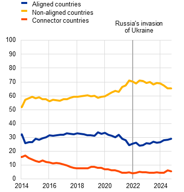 18. Following Gopinath et al. (2024), countries are divided into three groups based on the 2021 ideal points distance. The aligned bloc includes countries in the top quartile in their political proximity to the United States, while the non-aligned bloc includes countries in the top quartile in their political proximity to China. The connector countries bloc comprises the remaining economies.