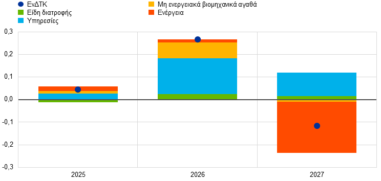 Οι επιδράσεις εκτιμήθηκαν με βάση τη δέσμη υποδειγμάτων Short-Term Inflation Projection, βλ. Bańbura et al., «A new model to forecast energy inflation in the euro area», Working Paper Series, No 3062, ECB, Frankfurt am Main, 2025· και Bańbura et al., «Forecasting inflation amid high volatility – the case of energy inflation», SUERF Policy Brief No 1255, September 2025.