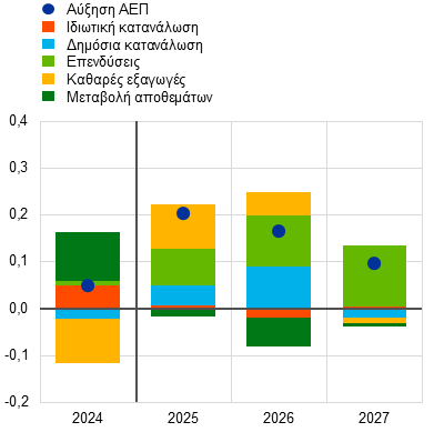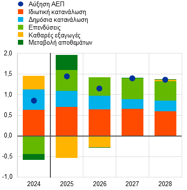 Η αύξηση του πραγματικού ΑΕΠ αναμένεται να συνεχίσει να βασίζεται στην εγχώρια ζήτηση, με την αρνητική συμβολή των καθαρών εξαγωγών να μειώνεται στο μηδέν το 2027-28. Όσον αφορά τις δαπάνες (Διάγραμμα 3, γράφημα α), η ιδιωτική κατανάλωση αναμένεται, βάσει των προβολών, να αυξηθεί έντονα σε όλη τη διάρκεια του χρονικού ορίζοντα, παρέχοντας τη μεγαλύτερη συμβολή στην αύξηση του πραγματικού ΑΕΠ. Η ενίσχυση των δαπανών των νοικοκυριών αναμένεται να στηριχθεί από την αυξανόμενη αγοραστική τους δύναμη, η οποία αντανακλά την ισχυρή αύξηση των μισθών και της απασχόλησης σε ένα περιβάλλον συνεχιζόμενης ανθεκτικότητας της αγοράς εργασίας. Επιπλέον, οι επενδύσεις αναμένεται να αυξηθούν με ταχύτερο ρυθμό από το ΑΕΠ καθ’ όλη τη διάρκεια του χρονικού ορίζοντα προβολής. Οι ιδιωτικές επενδύσεις αναμένεται να αντισταθμίσουν την επιβράδυνση των δημόσιων επενδύσεων το 2027-28 λόγω της λήξης της χρηματοδότησης του προγράμματος Next Generation EU (NGEU). Στη διάρκεια του χρονικού ορίζοντα προβολής, η αύξηση των επενδύσεων αναμένεται να προέλθει από τη μείωση της αβεβαιότητας, την αύξηση των δαπανών για την άμυνα και τις υποδομές, καθώς και από την ενίσχυση της κερδοφορίας και τη βελτίωση των συνθηκών ζήτησης που συνδέονται με την κυκλική ανάκαμψη. Αντιθέτως, η αύξηση των εξαγωγών αναμένεται να παραμείνει υποτονική παρά τη βελτίωση της εξωτερικής ζήτησης, καθώς οι επίμονες προκλήσεις ανταγωνιστικότητας της ζώνης του ευρώ, οι δασμοί των ΗΠΑ και η προηγούμενη ανατίμηση του ευρώ επηρεάζουν αρνητικά τις εξαγωγικές επιδόσεις. Αυτό είναι πιθανό να οδηγήσει σε συνεχείς απώλειες μεριδίων στις εξαγωγικές αγορές. Ως εκ τούτου, οι καθαρές εξαγωγές αναμένεται, βάσει των προβολών, να έχουν αρνητική συμβολή στην αύξηση του πραγματικού ΑΕΠ το 2025 και το 2026, καθώς οι εισαγωγές θα αυξάνονται με ταχύτερο ρυθμό από ό,τι οι εξαγωγές. Αυτή η αρνητική συμβολή προβλέπεται να αντισταθμιστεί εν μέρει από τη θετική συμβολή των μεταβολών των αποθεμάτων το 2025.
