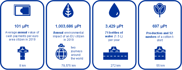 This PEF study finds that the single overall score for the average annual value of cash payments per euro area citizen (EAC) in 2019 is 101 micropoints (µPt). This very low score is equivalent to an EAC driving a standard car for 8 km, or to 0.01% of the total environmental impact of a European’s annual consumption of activities.[5] To further illustrate this point, it is worth comparing the results of the annual value of euro banknote payments with those of other everyday products, such as the production of a cotton T-shirt[6] that is washed once a week for a year (comparable to driving 55 km) or the manufactured bottles of water[7] consumed by an EAC in one year (equivalent to driving 272 km), as illustrated in the figure below.