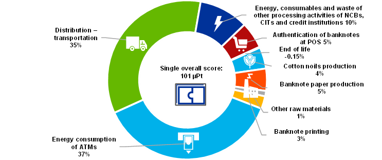 The main activities contributing to the environmental footprint of euro banknotes are the powering of ATMs (37%), transportation (35%), processing activities in the distribution stage (10%), paper manufacturing (9%) and the authentication of banknotes at the point of sale (POS) in the use stage (5%).