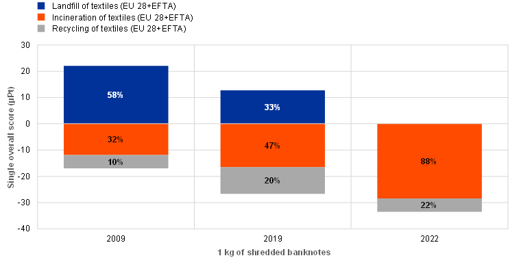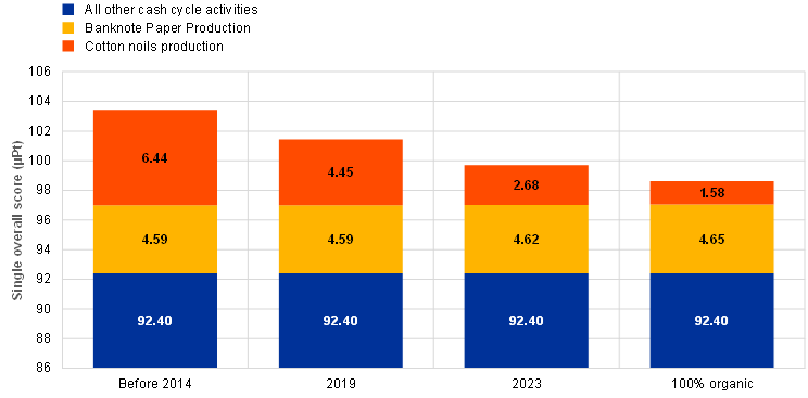 The single overall score for this euro PEF study, obtained after normalising and weighting the results calculated for the 16 impact categories considered in the PEF methodology,[23] is 101 µPt, which is a very low score (each impact category’s contribution to the single overall score of 101 µPt is shown as a percentage in Annex C). Furthermore, the environmental impact has improved since the Eurosystem conducted the LCA study to assess the environmental impact of the first series of euro banknotes in 2004.