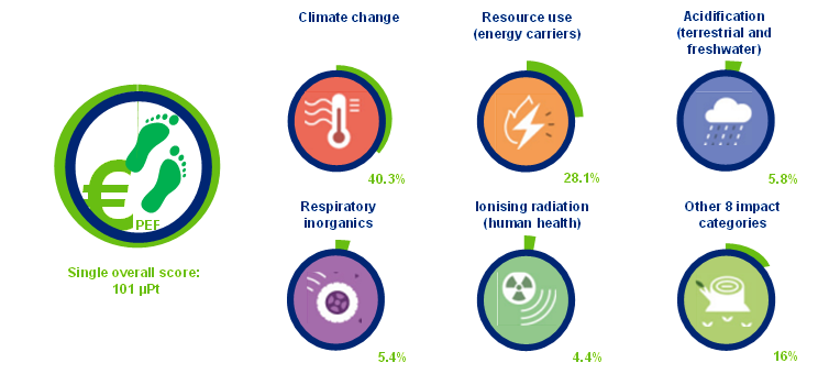 This PEF study is based on the methodology of a life cycle assessment, in that it covers 16 given environmental impact categories, including climate change due to greenhouse gas emissions, ozone depletion, land and water use and resource depletion. A complete list of the impact categories covered is available in Annex A.