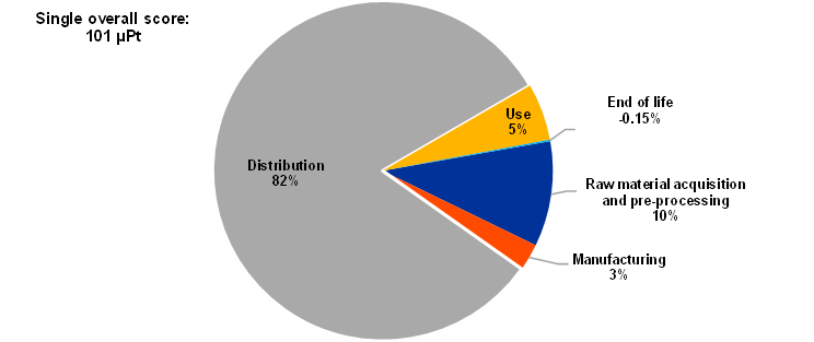 Percentage contribution of each life cycle stage to the single overall score