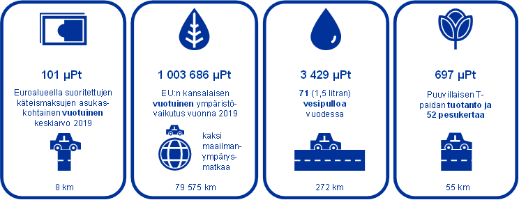Euroalueella suoritettujen käteismaksujen asukaskohtainen keskiarvo vuonna 2019 saa tutkimuksessa yhteensä 101 mikropistettä (µPt). Vastaava hyvin alhainen pistemäärä saataisiin, jos euroalueen asukas ajaisi tavallisella autolla 8 kilometriä. Pistemäärä olisi 0,01 % EU:n vuotuisen kulutustoiminnan yhteenlasketusta ympäristövaikutuksesta.[5] Tulosta voidaan havainnollistaa myös vertaamalla setelimaksujen vuotuista arvoa muiden päivittäistuotteiden vuotuiseen arvoon. Setelimaksuja verrataan vuodessa viikoittain pestävän puuvillaisen T-paidan[6] tuotantoon (mikä vastaa 55 kilometrin automatkaa) tai euroalueen kansalaisen teollisten pullovesien vuosikulutukseen[7] (mikä vastaa 272 kilometrin automatkaa). Ks. kaavio 1.