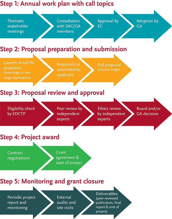 Proposals to EDCTP for funding must be submitted in response to published calls for proposals. An overview and indicative timetable for the publication of calls is provided in the EDCTP2 annual work plan while notifications of individual calls for proposals are given under the Funding section and via the EDCTPgrants system. Each call contains the key information that is needed in order to prepare a proposal, including the eligibility and evaluation criteria.