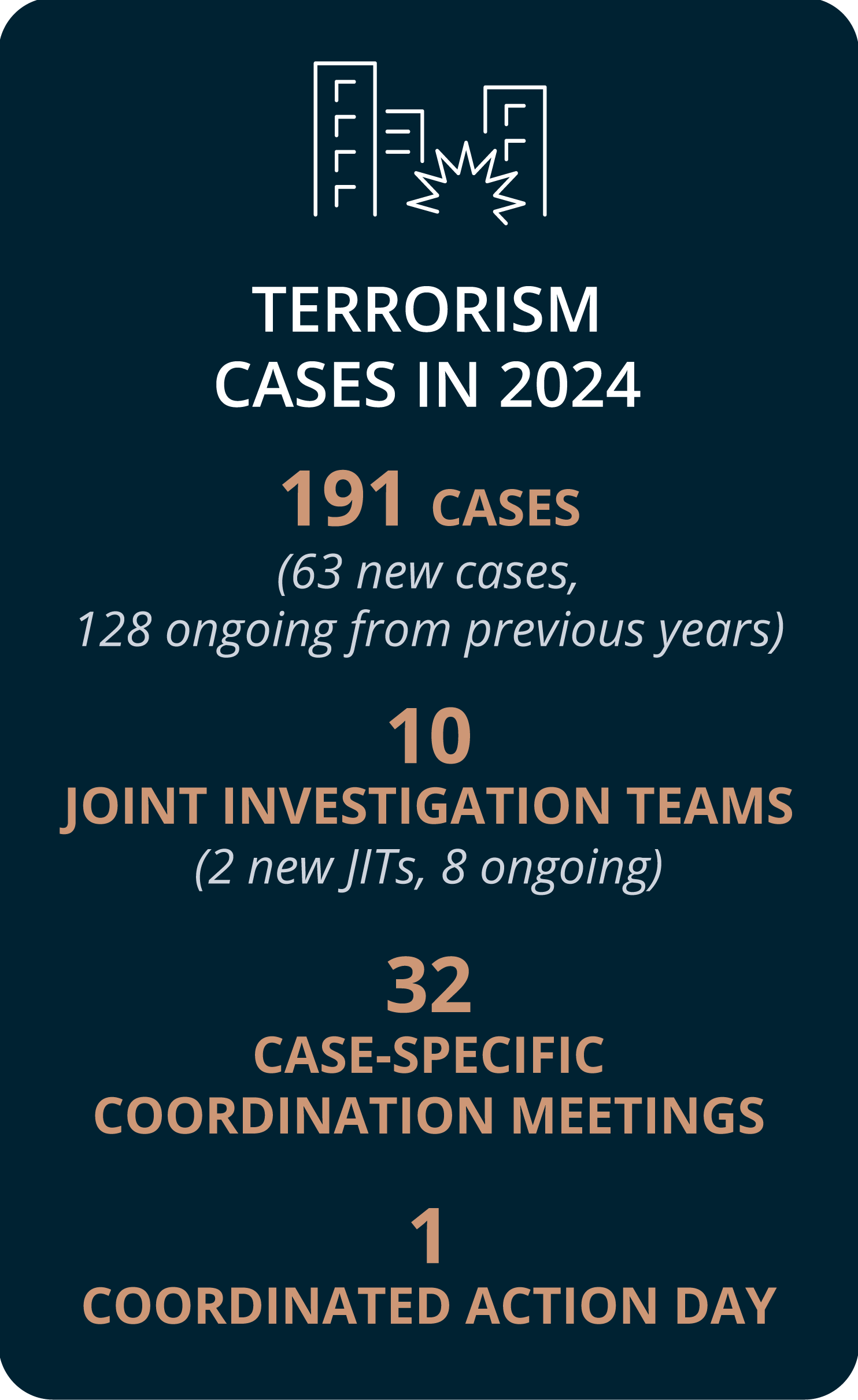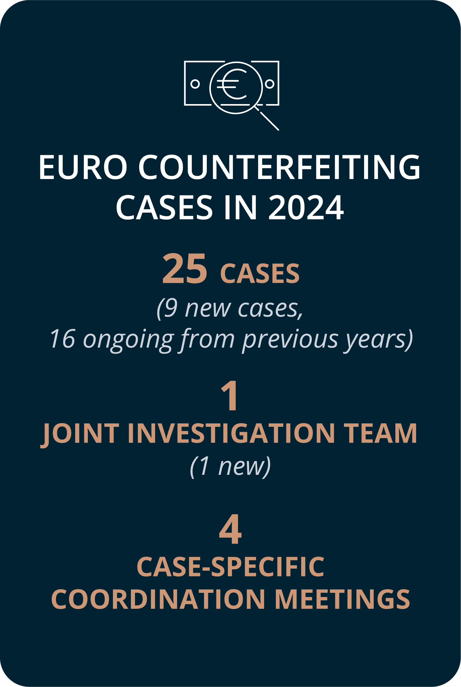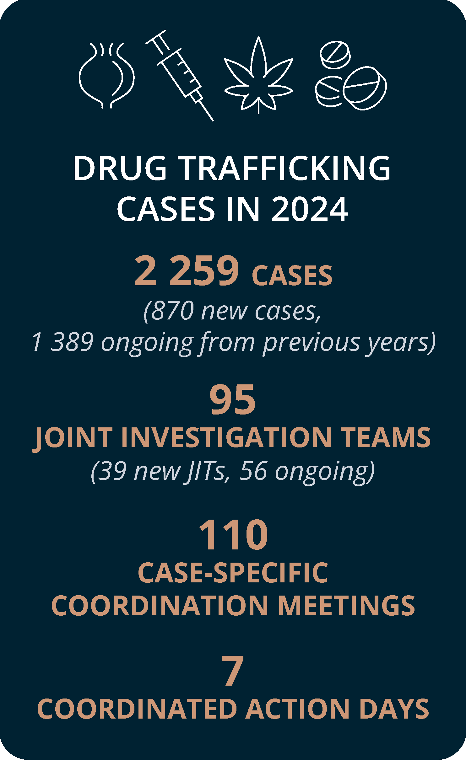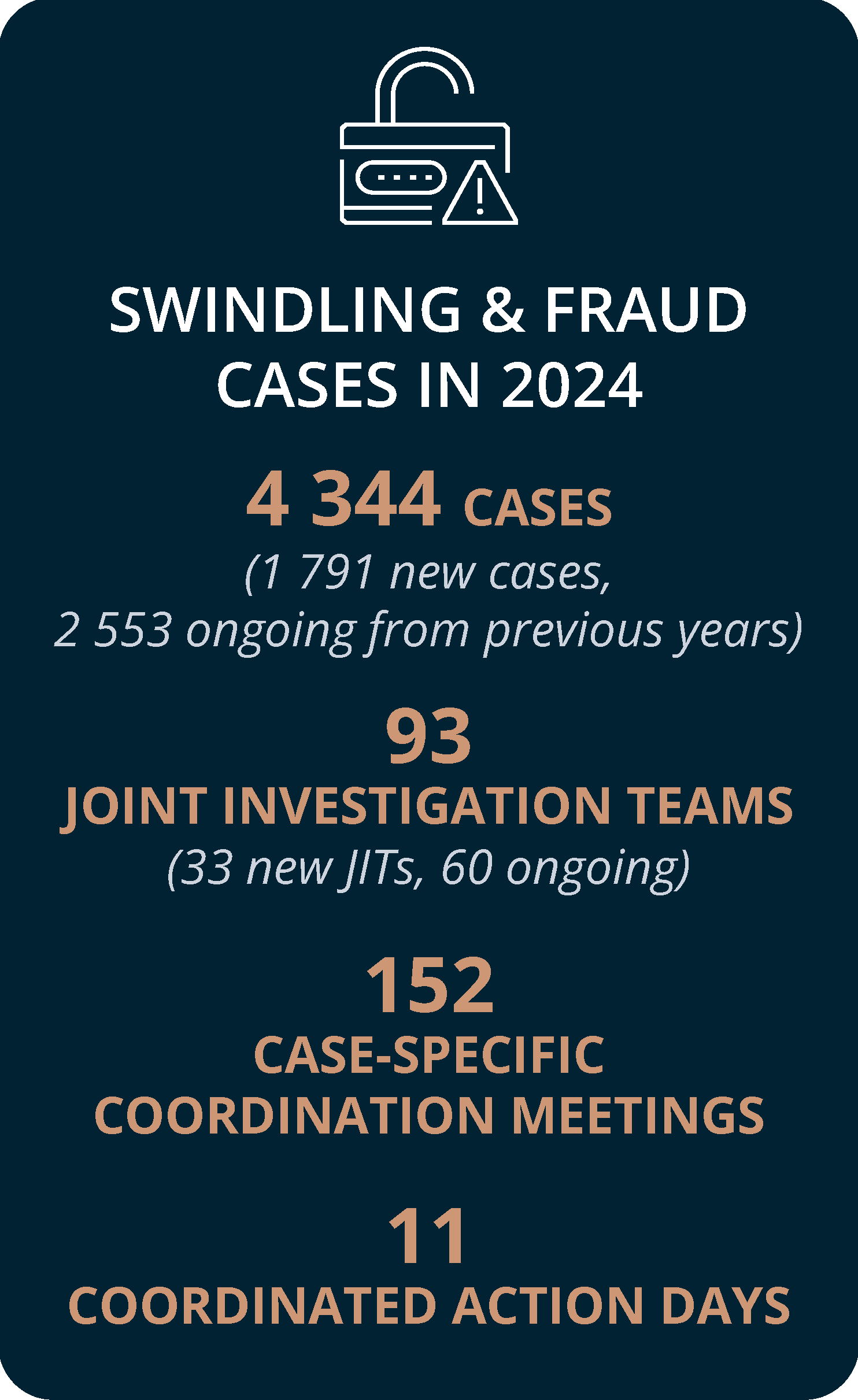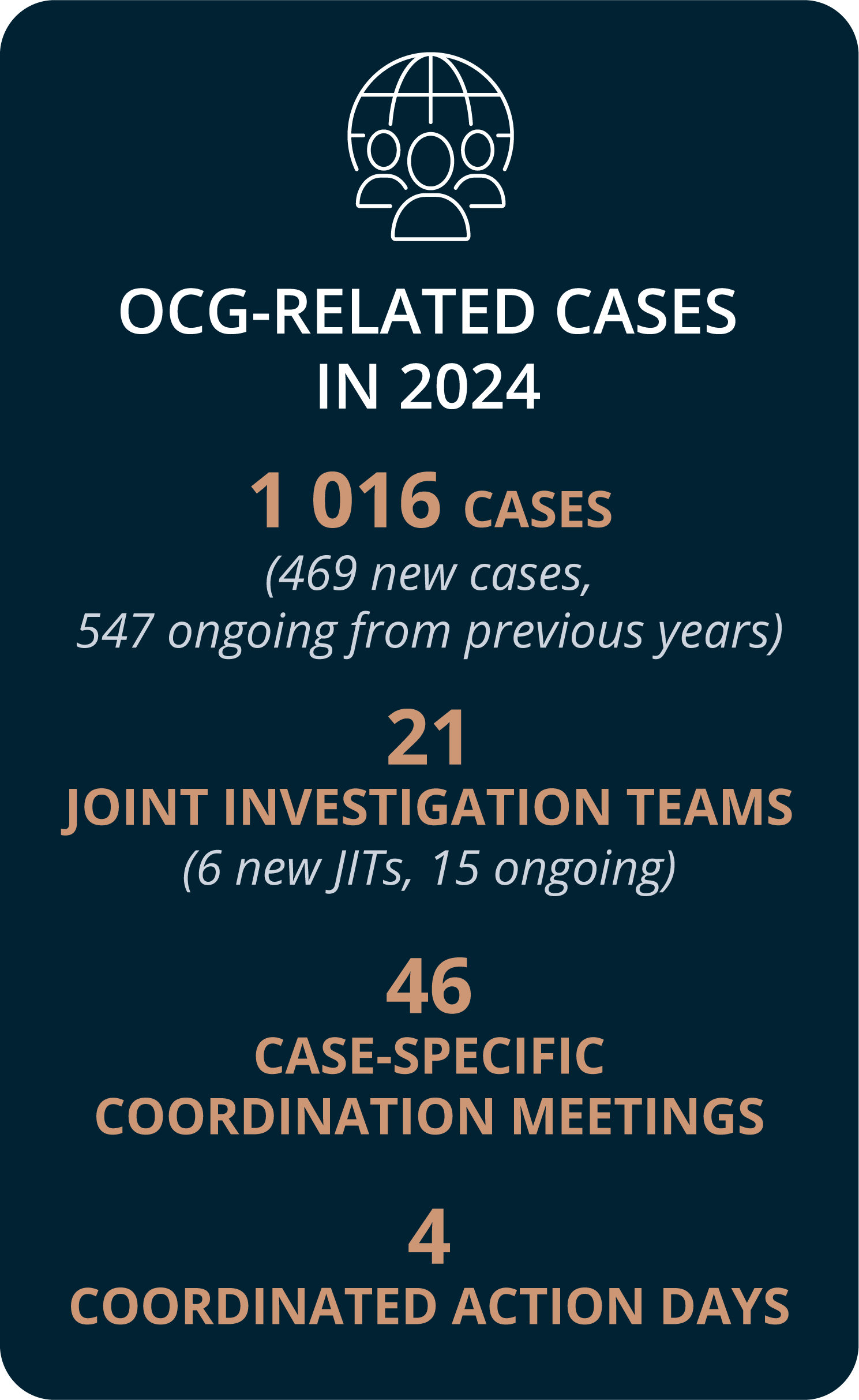 Eurojust’s casework is demand-driven, and the five main crime types concerned in new cases registered in 2024 were swindling and fraud, drug trafficking, money laundering, mobilised organised crime groups (OCGs) and cybercrime.