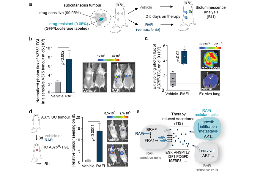 This response, termed therapy-induced secretome (TIS), does not only enhance the survival of drug-sensitive cells, but also stimulates the proliferation, invasion, and metastasis of drug-resistant clones that are lurking in the background of the regressing tumours (Figure 2a-c). We also found that the regressing tumours in our animal models act as potent ‘magnets’ to attract drug-resistant cells from the circulation. This process, termed self-seeding, could add an additional layer of complexity to the treatment and relapse of patients on targeted therapy (Figure 2d). Our findings establish a general mechanism by which drug-stressed tumour cells can aggravate cancer progression and it could – at least partly – explain why targeted therapies rarely lead to complete tumour regression.