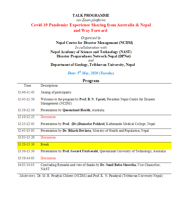 1) COVID-19 Pandemic: Experience Sharing from Australia & Nepal and Way Forward, organised by the Nepal Centre for Disaster Management in collaboration with Nepal Academy of Science and Technology.