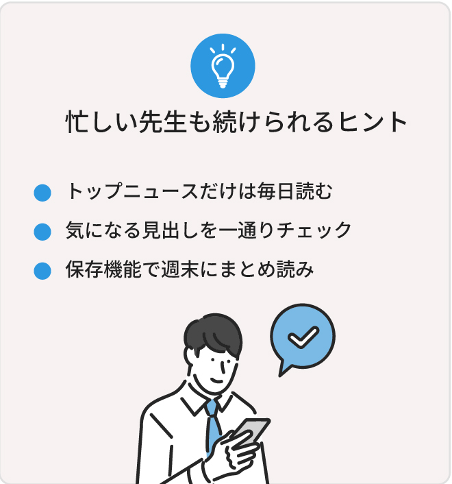 なかなか新聞を読む時間を取れませんが、メールマガジンやアプリでならちょっとした時間に目を通すことができ、とても役立っています 。それらの情報を得ることが、私にとってこれから目指す教育とこれから目指す働き方に大きな好影響を与えていると感じています。