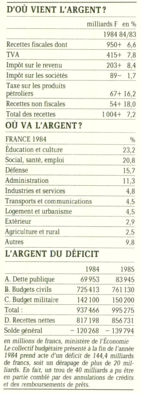 « Trop d'impôt, pas d'impôt : on asphyxie l'économie, on limite la production, on limite les énergies et je veux absolument revenir à des chiffres plus raisonnables. » Le 13 septembre 1983, François Mitterrand se livrait à cette profession de foi à la télévision. Un an plus tard — presque jour pour jour — Pierre Bérégovoy a la lourde tâche de montrer comment ce choix a été appliqué au travers du projet du budget pour 1985.