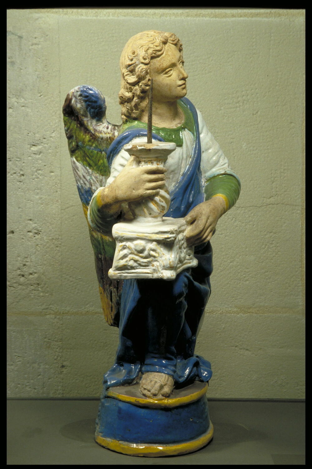 Le relief de saint Sébastien, l’une des premières œuvres des Della Robbia à entrer dans les collections du Louvre, est acquis en 1852 chez l’antiquaire parisien Henri Delange. L’assemblage de la statue de l’encadrement et du fond remonte probablement au 19e siècle. Mais la conception d’origine était probablement différente. La sculpture peut avoir été conçue soit comme une figure isolée, probablement présentée sur un autel dans une niche, ou bien comme partie latérale d’un retable plus important. En tout état de cause, il est peu probable qu’à l’origine la figure centrale ait été « posée » sur un fond en bois, mais plus certainement encadrée par d’autres élément en terre cuite.
