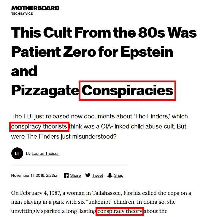 Just months after Epstein’s death, in October 2019, the FBI began releasing hundreds of Finders investigation documents to their Vault. The publication sparked a storm of attention, but virtually no corporate press coverage aside from a piece by Vice, which framed any interest in the subject as a conspiracy theory.