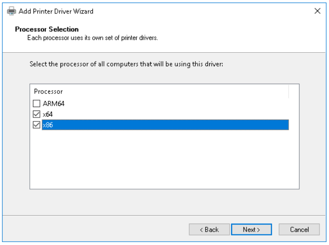 Select the x64 and x86 checkboxes; then click Next. The Printer Driver Selection dialog box is displayed.