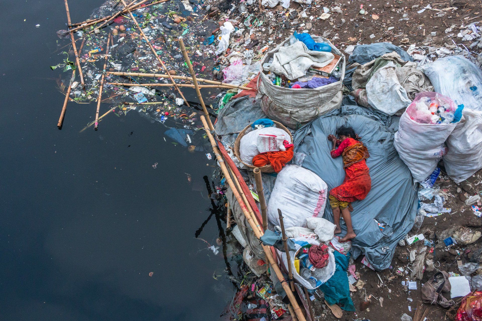Description: A woman sleeps on a trash pile beside the river in Dhaka.
