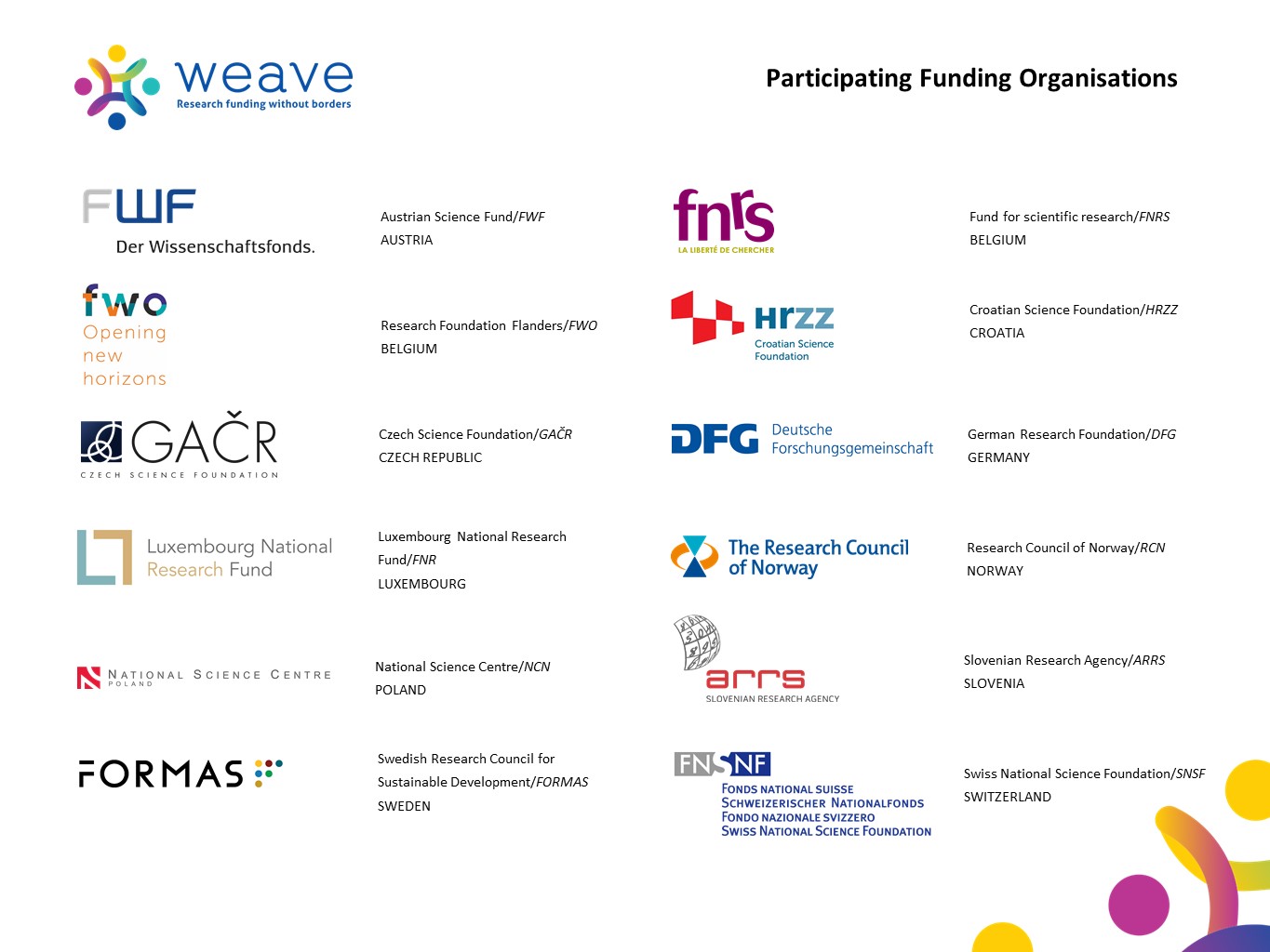 Weave has been supported by Science Europe over the course of the last three years. The Science Europe Office has assisted the task force, which is chaired by the Swiss National Science Foundation (SNSF) and has provided a forum for these exchanges. The current 12 participating funding organisations include: