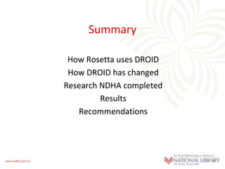 DROID is a tool used by the National Digital Heritage Archive (NDHA) to automatically identify file formats during ingest into the Rosetta digital preservation system. The NDHA conducted research comparing format identification results across different versions of DROID and found that 75% of file types were identified consistently, while 26% showed multiple possible identifications. The NDHA recommends creating a test dataset spanning all file formats, more research on format identification persistence, and robust testing of new DROID signatures to limit impacts on users.
