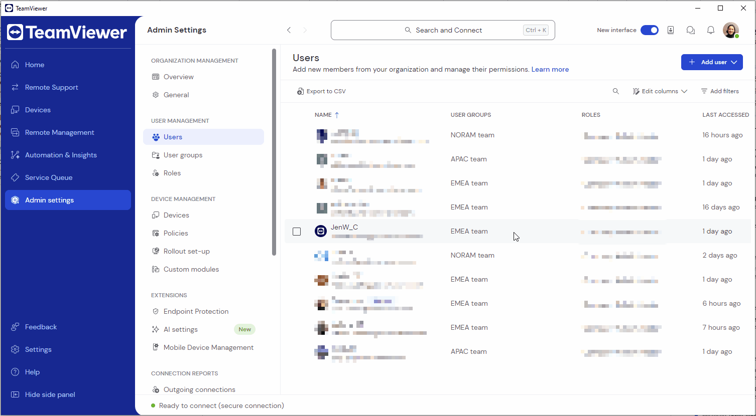 5. Select which change you want to execute. You can change the remote control settings, assign or unassign roles, enforce, remove enforcement, or deactivate two-factor authentication.