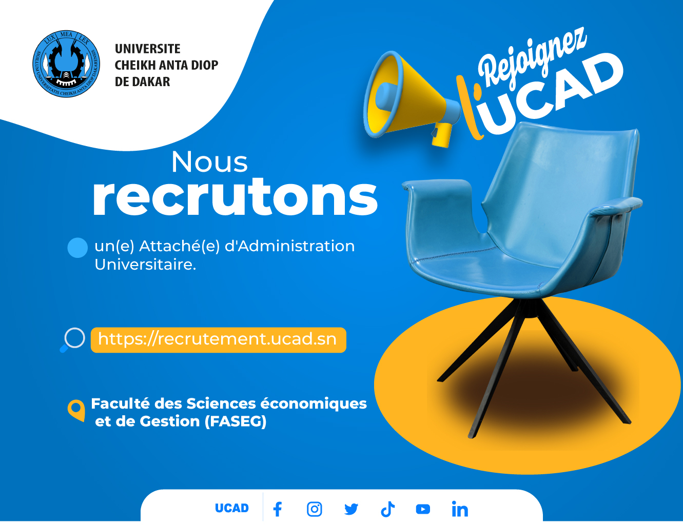 Le Recteur de l'Université Cheikh Anta Diop de Dakar recrute pour le compte de la Faculté des Sciences économiques et de Gestion (FASEG), un(e) Attaché(e) d'Administration Universitaire.