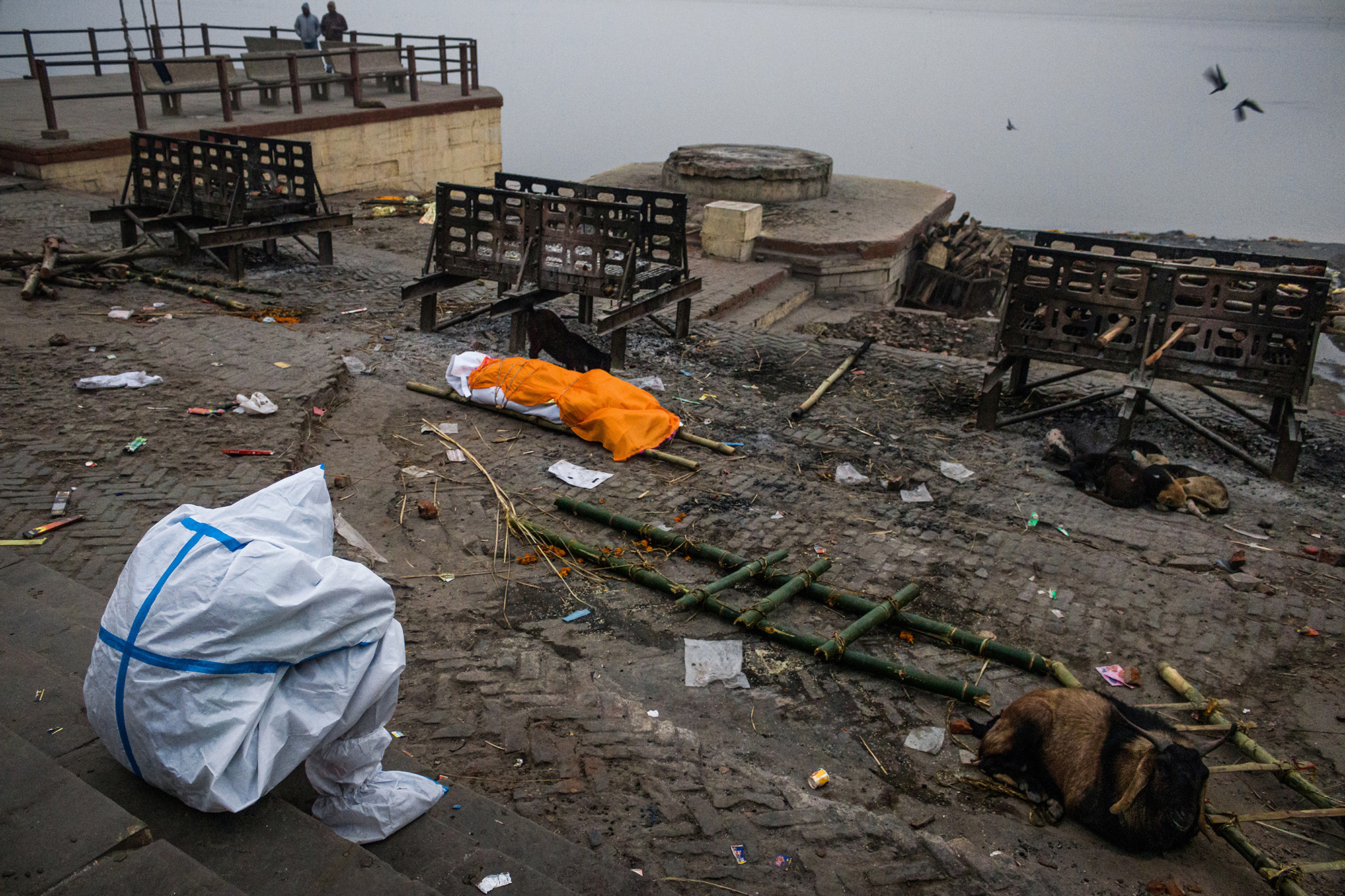 A family member bows his head and sits completely broken at Harishchandra Crematorium. His loved one passed away of Covid-19 and the body can be seen wrapped. (January, 2021) Photo/Mohit Khetrapal