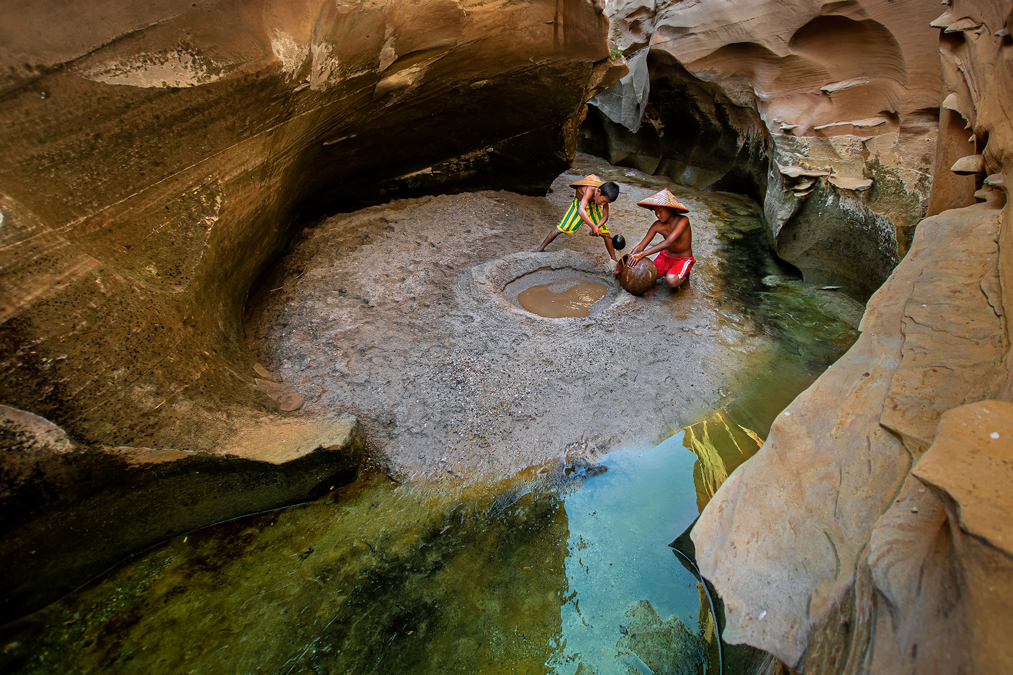 Two children in a local village fetching drinking water between the rocks. (January, 2021) Photo/Aung Kyaw Zaw