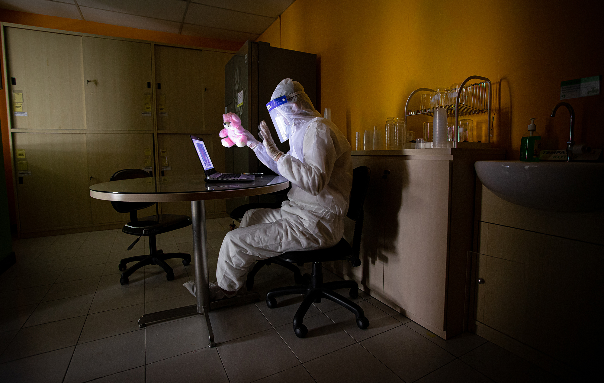 A health worker is having a video call with his family while using personal protective equipment in a break room. (January, 2021) Photo/Gerdie Hutomo