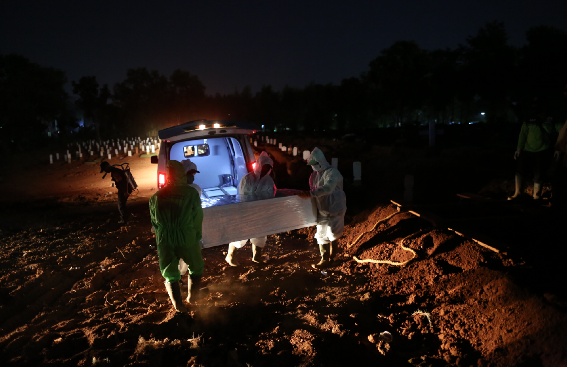 Cemetery officers carry the bodies of COVID-19 victims arriving from the hospital to be buried at Pondok Ranggon, one of two public cemeteries in Jakarta, Indonesia dedicated to those taken by the disease. In an effort to minimize the spread of the coronavirus, the government requires that bodies be immediately placed into graves, without being preceded by a final tribute ceremony, as is customary.