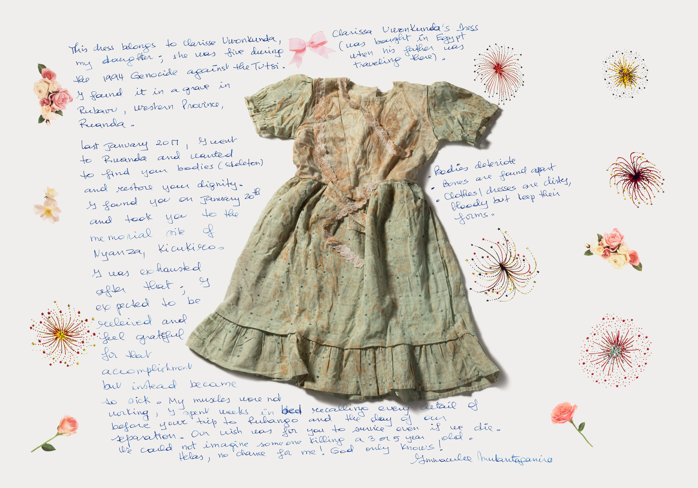 This dress belongs to Clarisse Uwonkunda, my daughter; she was five during the 1994 Genocide against the Tutsi. I found it in a grave in Rubavu, Western Province, Rwanda. Last January 2017, I went to Rwanda and wanted to find your bodies (skeleton) and restore your dignity. I found you on January 20th and took you to the memorial site of Nyanza, Kicukiro. I was exhausted after that; I expected to be relieved and feel grateful for that accomplishment but instead became so sick. My muscles were not working, I spent weeks in bed recalling every detail of before your trip to Ruhango and the day of our separation. Our wish was for you to survive even if we die. We could not imagine someone killing a 3 or 5 year old.