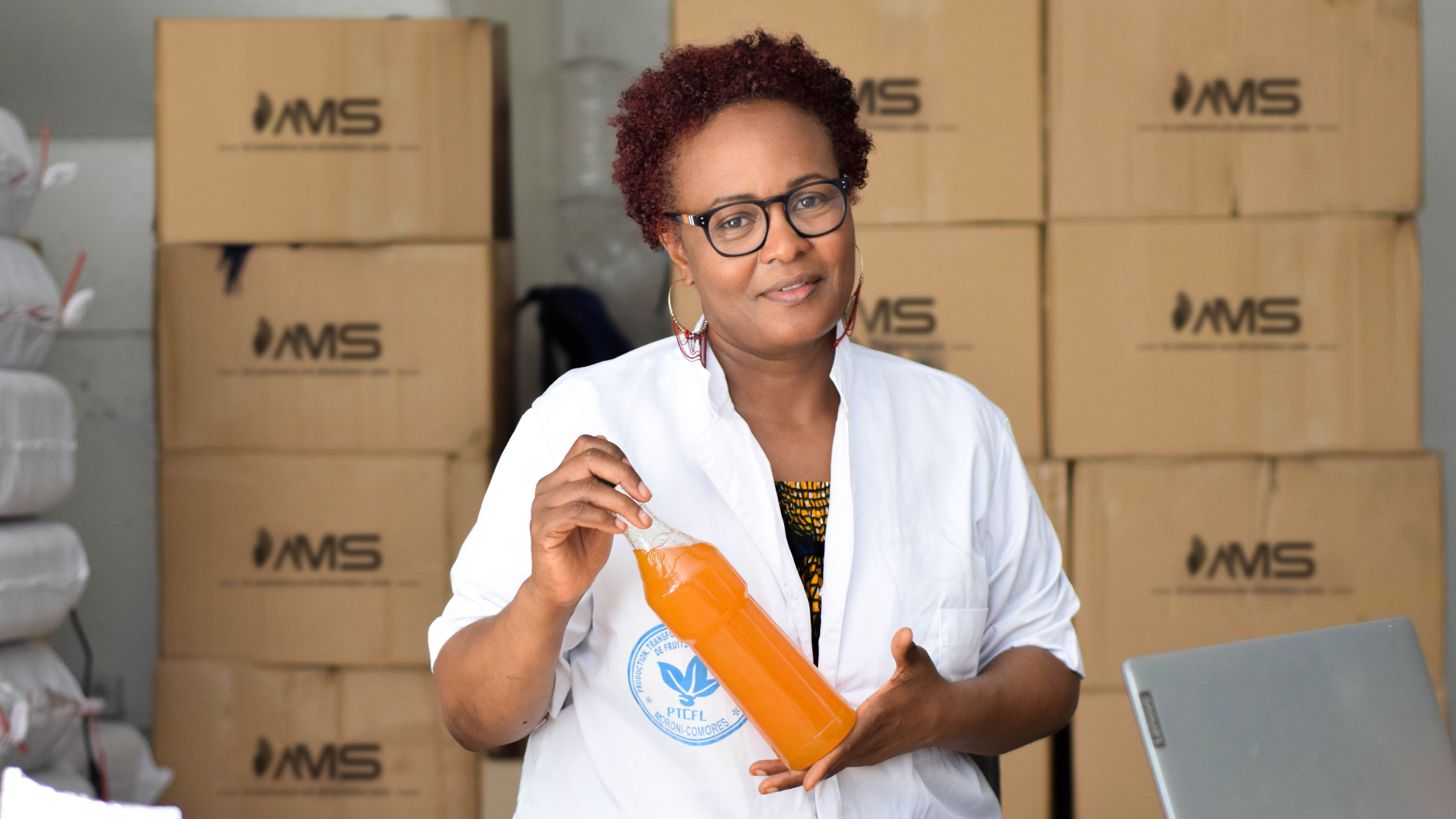 The UN Industrial Development Organization (UNIDO) supports women-led agribusinesses in Small Island Developing States (SIDS) with production processes, business planning and market access. With help from UNIDO and partners in Comoros, Asna strengthened her enterprise, improved product quality, and created economic opportunities for her community. Photo: UNIDO