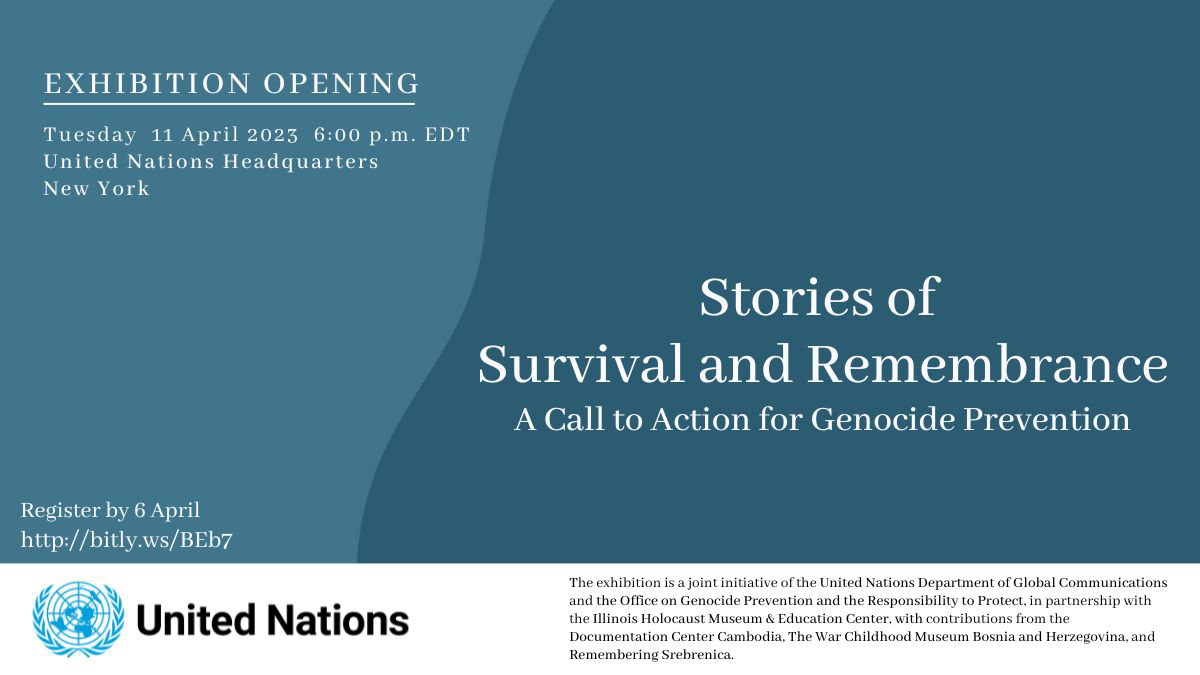 "Stories of Survival and Remembrance – a Call to Action for Genocide Prevention" is an exhibit highlighting the painful legacy of atrocity crimes in Cambodia, the Holocaust, Srebrenica and the 1994 Genocide Against the Tutsi in Rwanda.