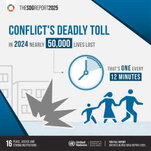 - Rising conflicts and violent organized crime persist around the world, causing immense human suffering and hampering sustainable development. The number of forcibly displaced people reached an unprecedented 123.2 million by the end of 2024. Civilian casualties in armed conflicts surged 40 per cent in 2024.