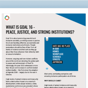 Goal 16 is about promoting peaceful and inclusive societies, providing access to justice for all and building effective, accountable and inclusive institutions at all levels. People everywhere should be free of fear from all forms of violence and feel safe as they go about their lives whatever their ethnicity, faith or sexual orientation.
